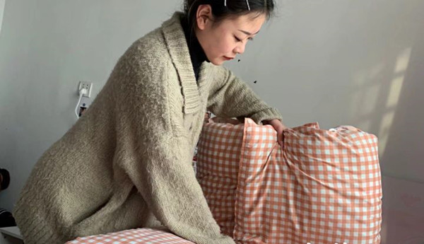 (图片为赵梦思同学参与家庭劳动叠被子的瞬间)