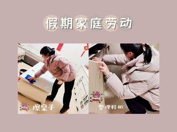 (图片为于慧慧同学参与家庭劳动擦桌子、整理鞋柜的瞬间)