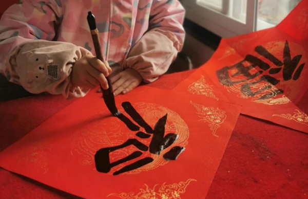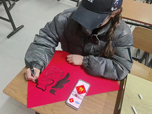 (图片为19级新闻采编专业同学与家人写“福”字的瞬间)
