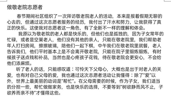 (图片为19级汉语言文学1班同学分享自己在敬老院做志愿的感想截图)