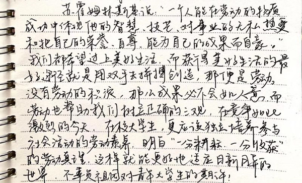 “看着同学们笔下的劳动作品展,这些身边的普通劳动者在平凡的岗位上勇挑重担、担当作为,为抗疫胜利做出突出的贡献的感人故事,领悟到了习近平总书记说的‘劳动光荣,创造伟大’的深刻内涵!”19级汉语言文学4班左晶晶说。