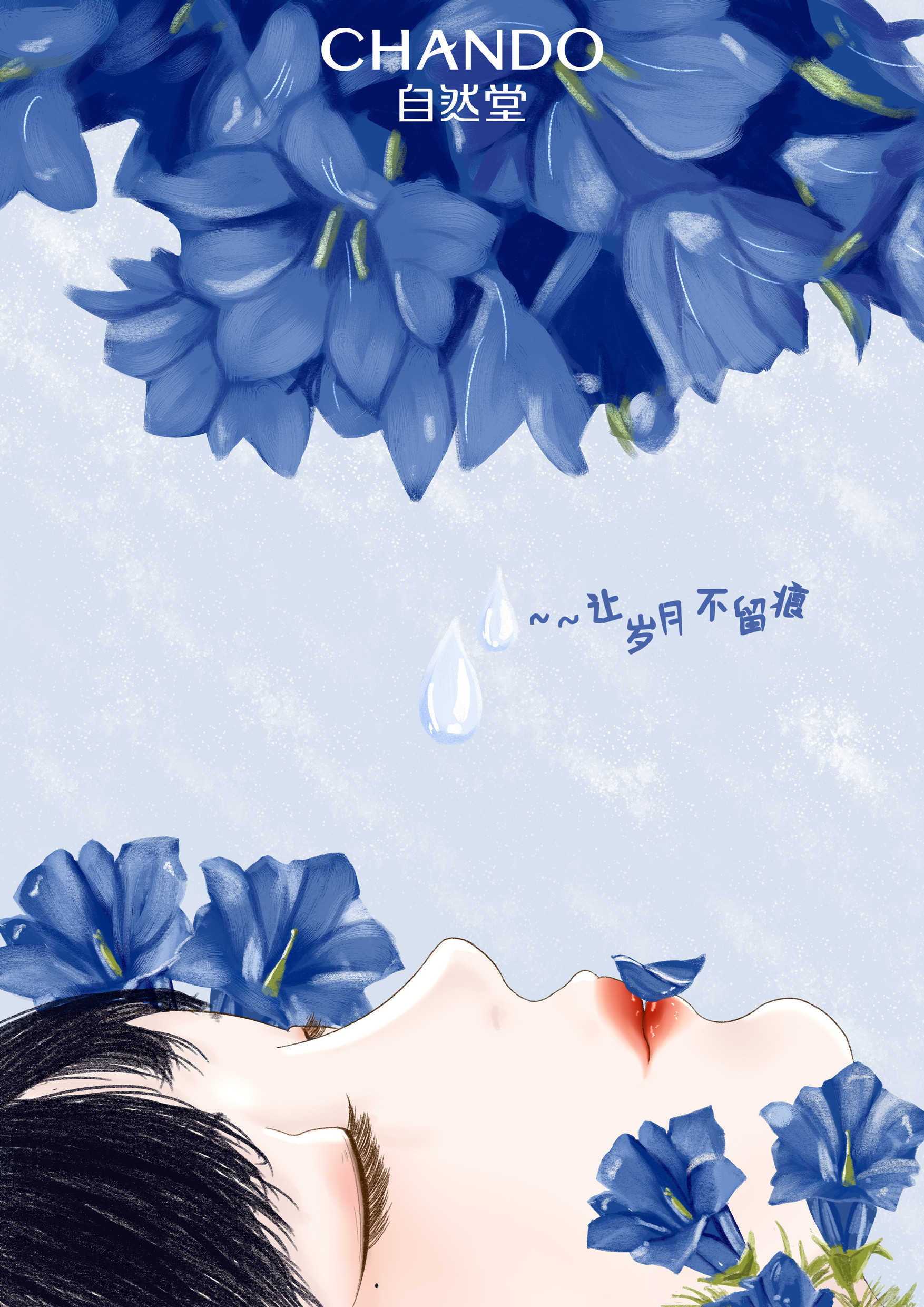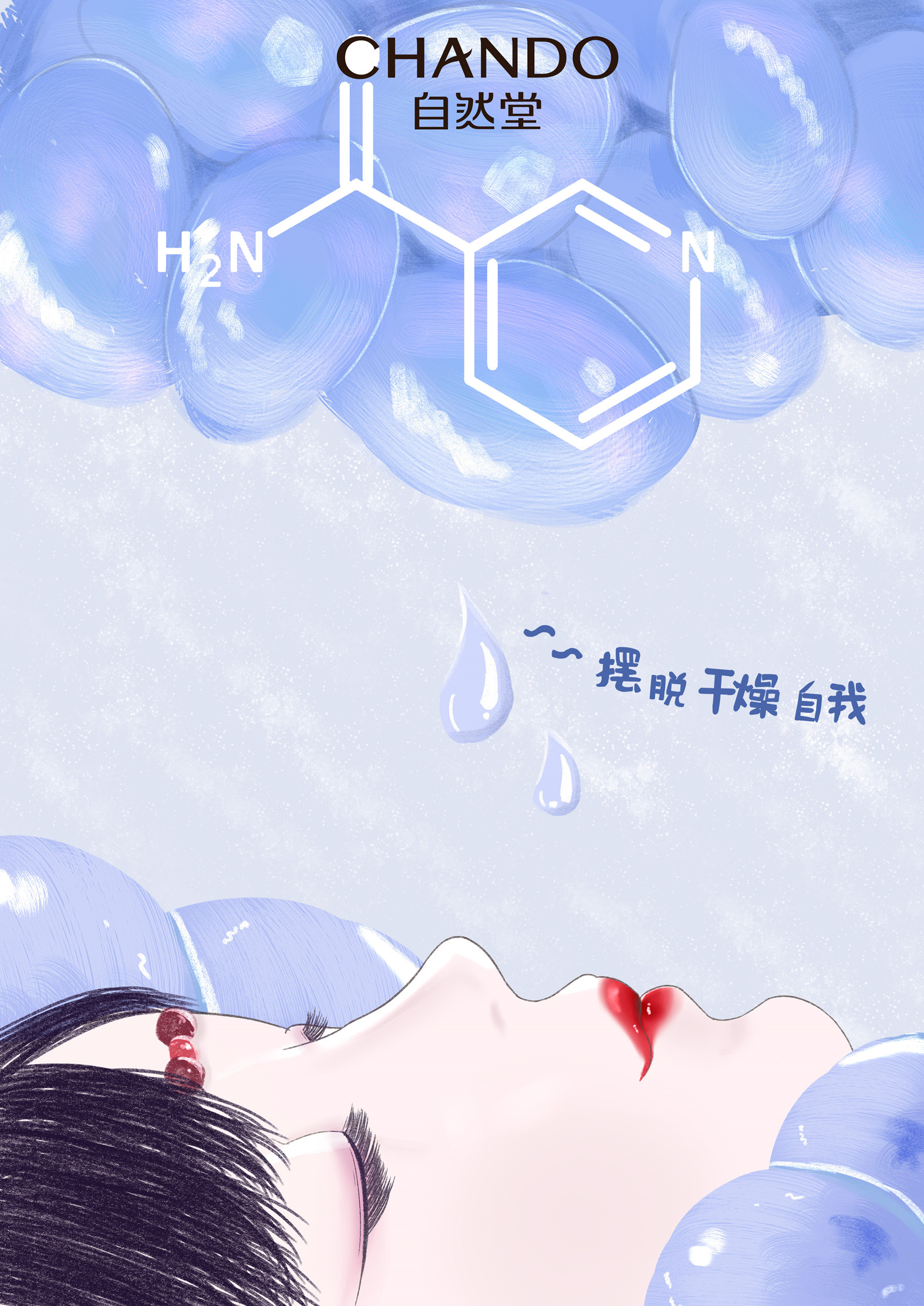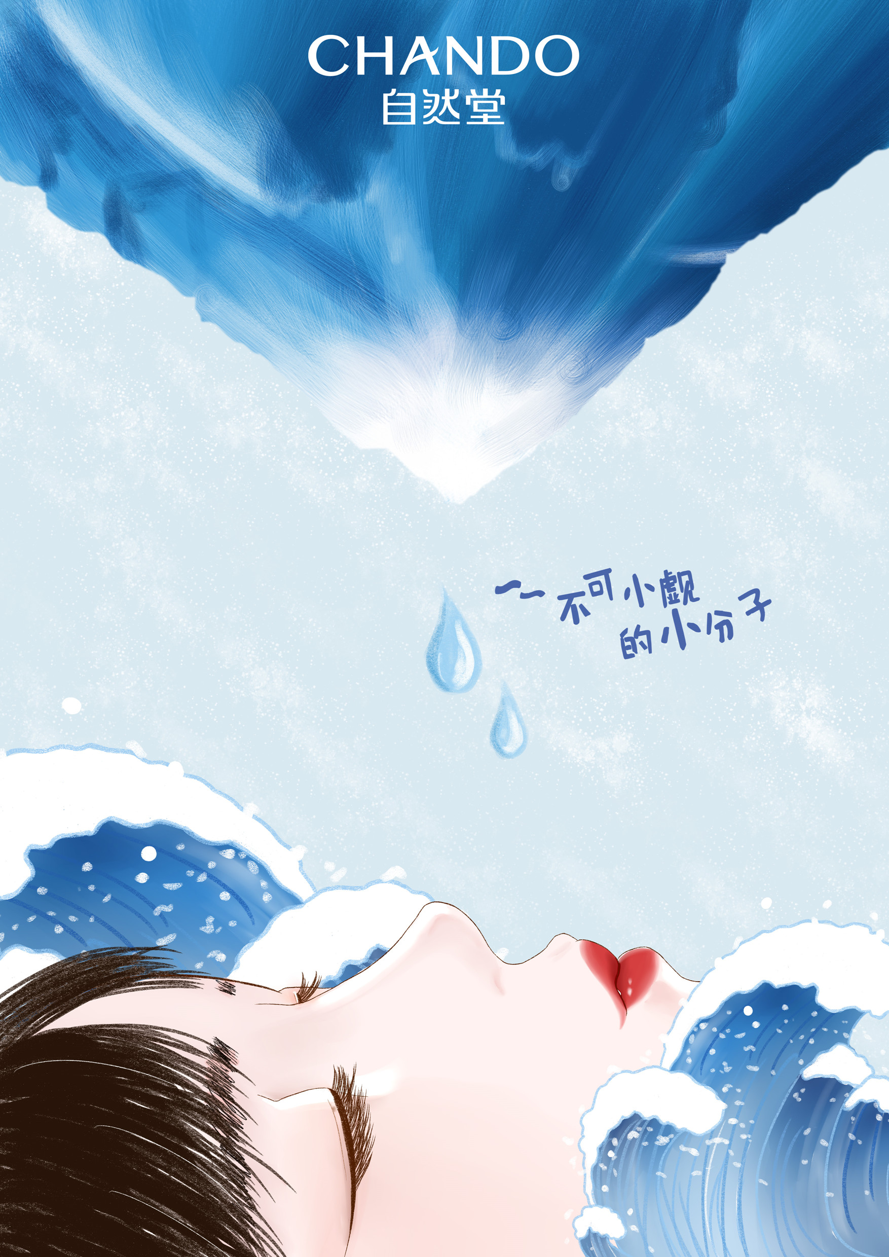 作品简介:系列作品上部分以龙胆花、冰川水、烟酰胺三种元素构成,体现出自然堂冰肌水的成分。中间水滴表明其功效有不留痕、小分子、摆脱干燥等。