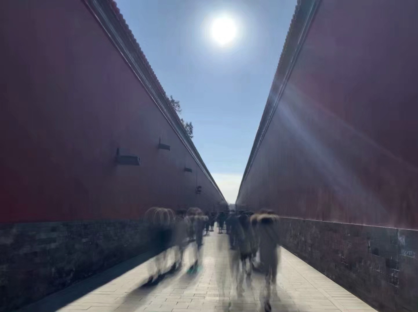 冬日清晨,阳光洒上红墙绿瓦,游客们来往于两墙之间,日光直洒大地与红墙,展现出长河落日永不灭,利用长曝光使游客们的往来产生虚无缥缈之感,从而反映出历史的悠长以及对过往的缅怀。当于两城墙间行走,这种来来往往的虚无感让人感到压抑,是属于故宫的压抑,红墙黄瓦不过是黄粱一梦罢了!