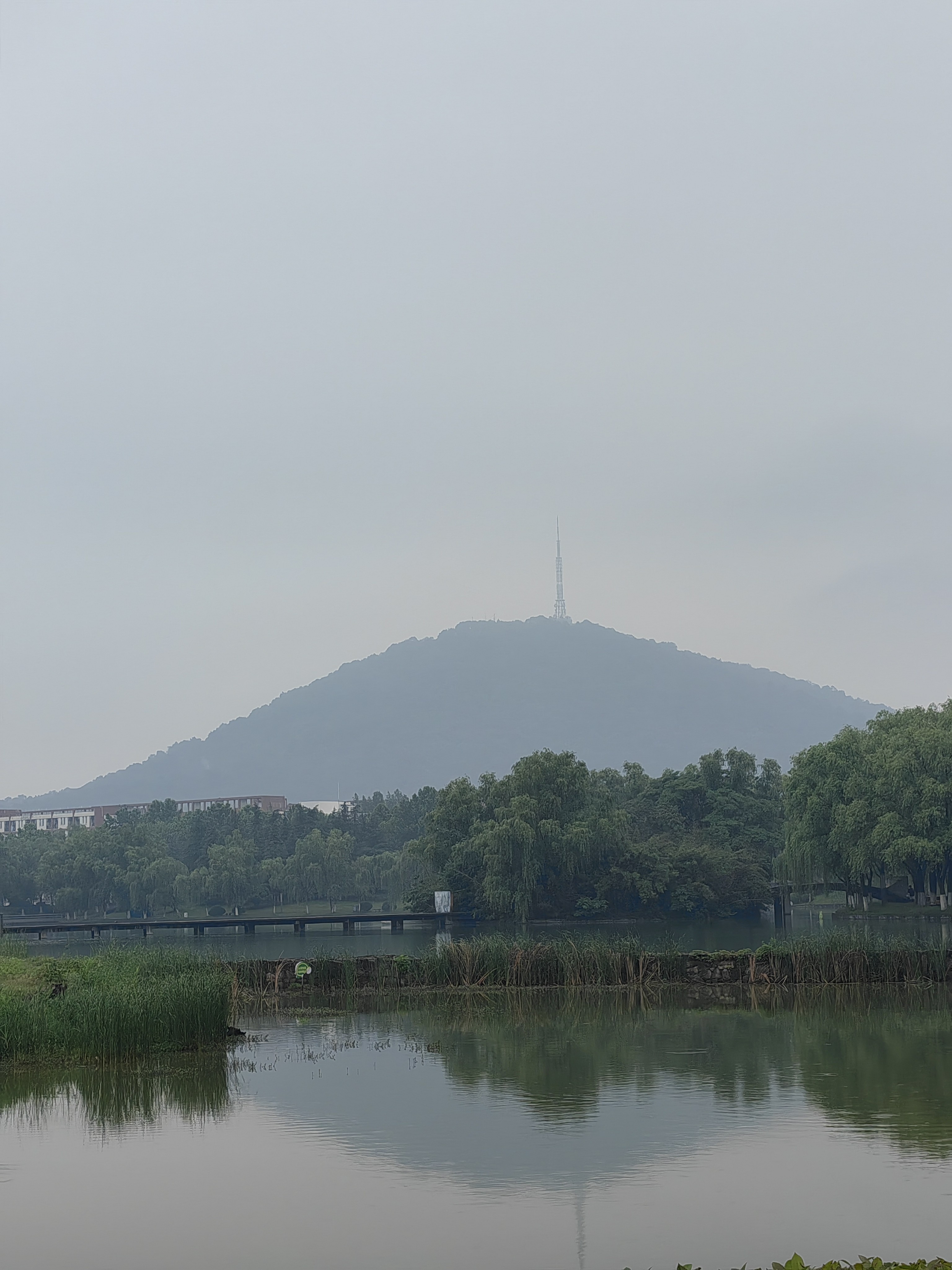 创作简介:在理论课上学习了景别、角度等知识后,我们在实践课上进行了实操。这幅图片拍摄于公司的东门处,从远处平视山与倒影。阴天,校园和远处的大蜀山都笼罩着雾色,远处的青山倒映在如琴湖中,形成了对称的图像。