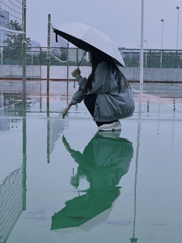 作品简介:该作品以雨天为主题,利用操场雨后留下的积水,让主体处在积水上方,拍摄出水中的倒影。从正面拍摄,让主体和倒影对称,使画面整体感强。画面整体色调偏冷,突出阴天的特色。画面内容让人感到静谧中包含一丝孤独感。