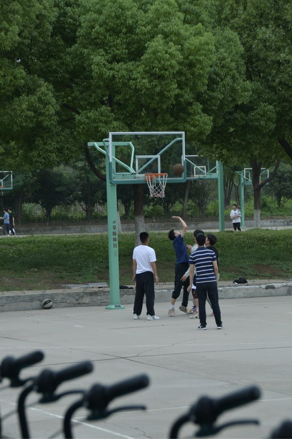 创作简介:这张作品主题是生命在于运动,我通过不同角度地抓拍篮球场运动中的瞬间得到这幅作品。我所在的位置是在打篮球员工们的左后方,且距篮球场地面有一定高度,所以我选择以路边的一排共享单车右车把为前景,在后面方向拍摄他们的动作,通过微俯角度竖构图抓拍他们对抗的一瞬间得到这张作品。