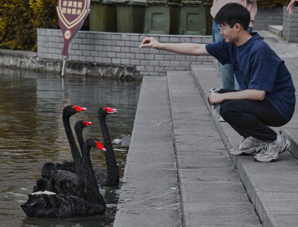 作品简介:四只昂扬着脑袋等待投喂的黑天鹅,展现华园的勃勃生机。侧拍,中景。