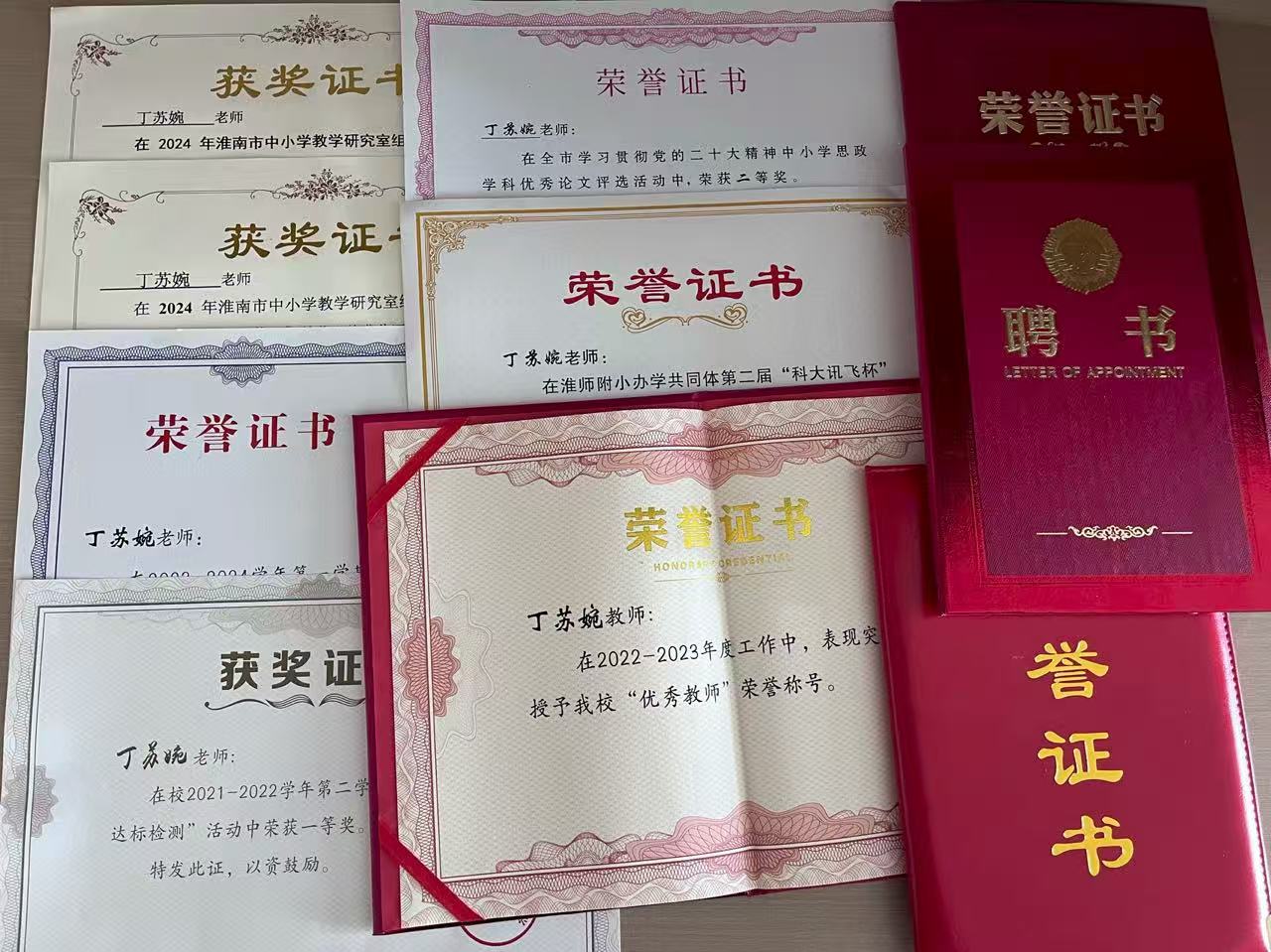 2023年,获淮南市智慧课堂一等奖;2024年,获淮南市优质课二等奖、党的二十大思政论文二等奖、中小学教育论文二等奖;2025年,获淮南市班主任基本功大赛二等奖,所带班级获评市级“先进班集体”。