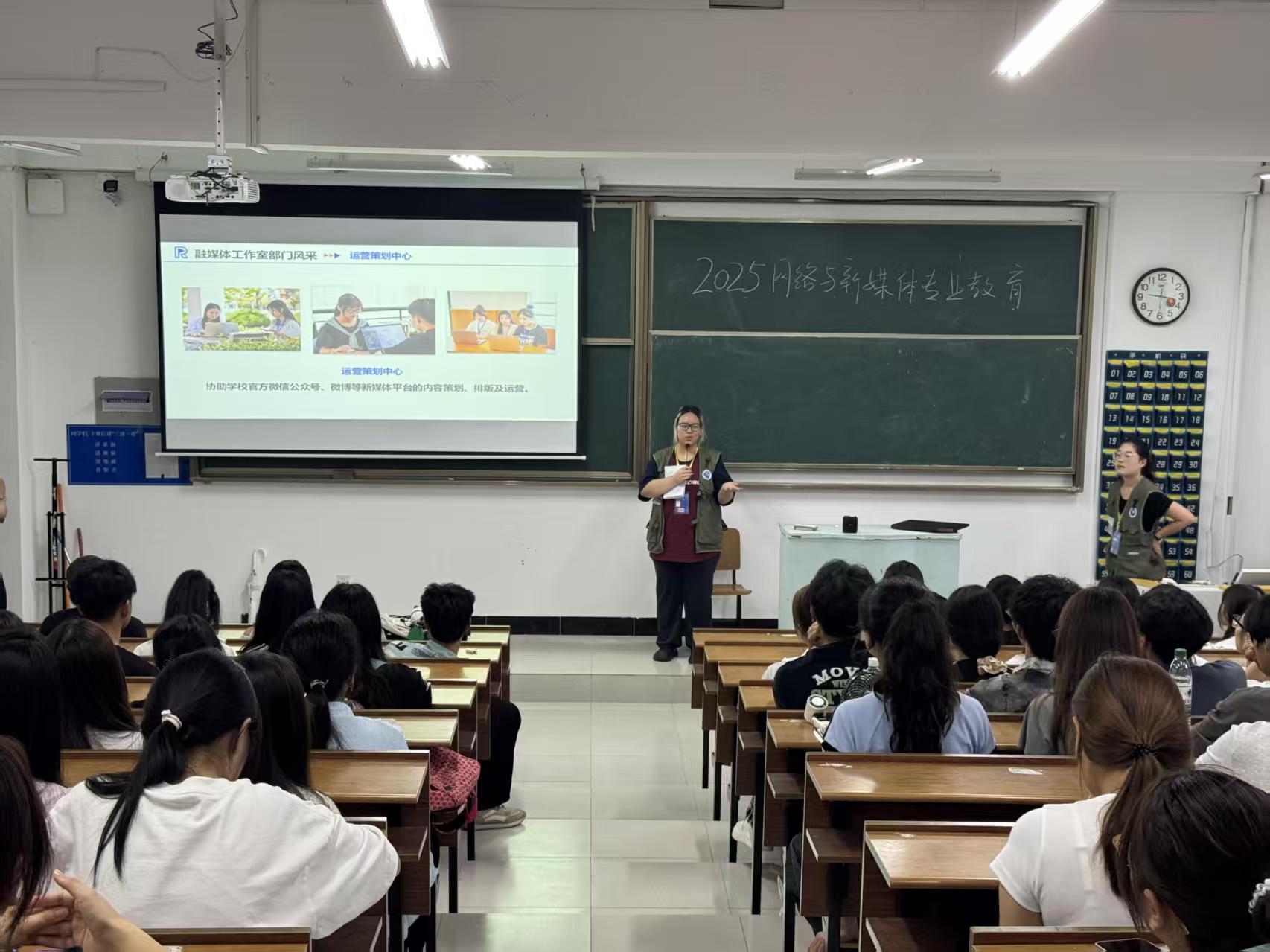 活动还特邀公司融媒体工作室的骨干成员进行分享。他们紧密结合广告学、网络与新媒体专业特色,讲解了在实战中能学到的核心技能。“我们秉持‘融’字为先的理念:让粉丝有印象,让创意有分量,让话题成为品牌,让声音传得更远。”他们强调,“任何媒体形态都会随时代变迁,但核心的传播与创意能力永不过时。”